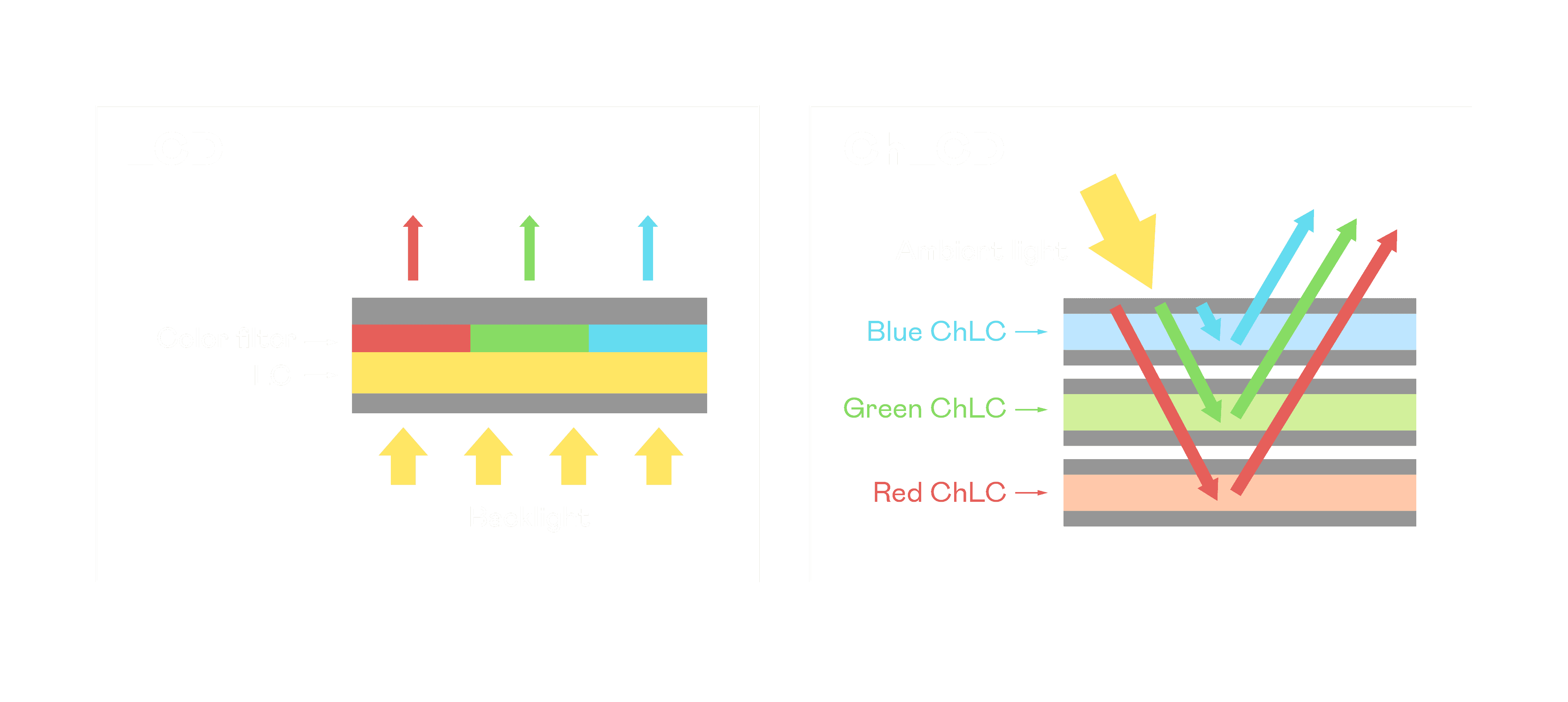 ChLCD 胆固醇液晶就如同纸张一样,,,,透过反射环境光来显示影像,,因此长时间观看不易造成人眼视觉疲劳,,,,可达到护眼效果。。。。当处于户外阳光下使用,,,LCD 影像容易失真而不易观看,,,但胆固醇液晶仍可维持较佳的影像品质。。