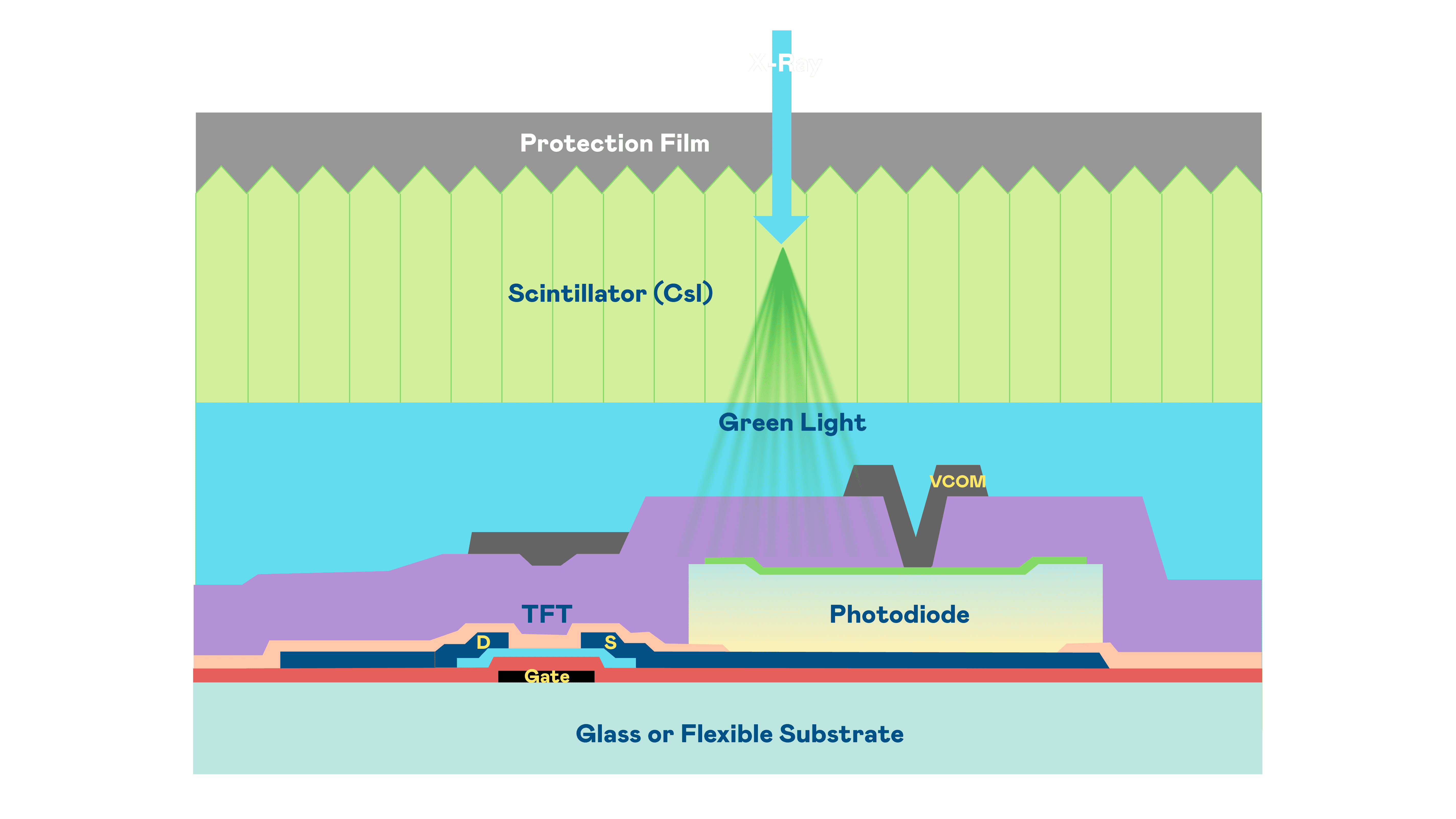 OBPay的X光影像感测阵列使用薄膜电晶体 (TFT) 作为每个像素的读取开关,,,搭配光电二极体(Photodiode)的光电转换元件,,,用以感测X光影像讯号。。